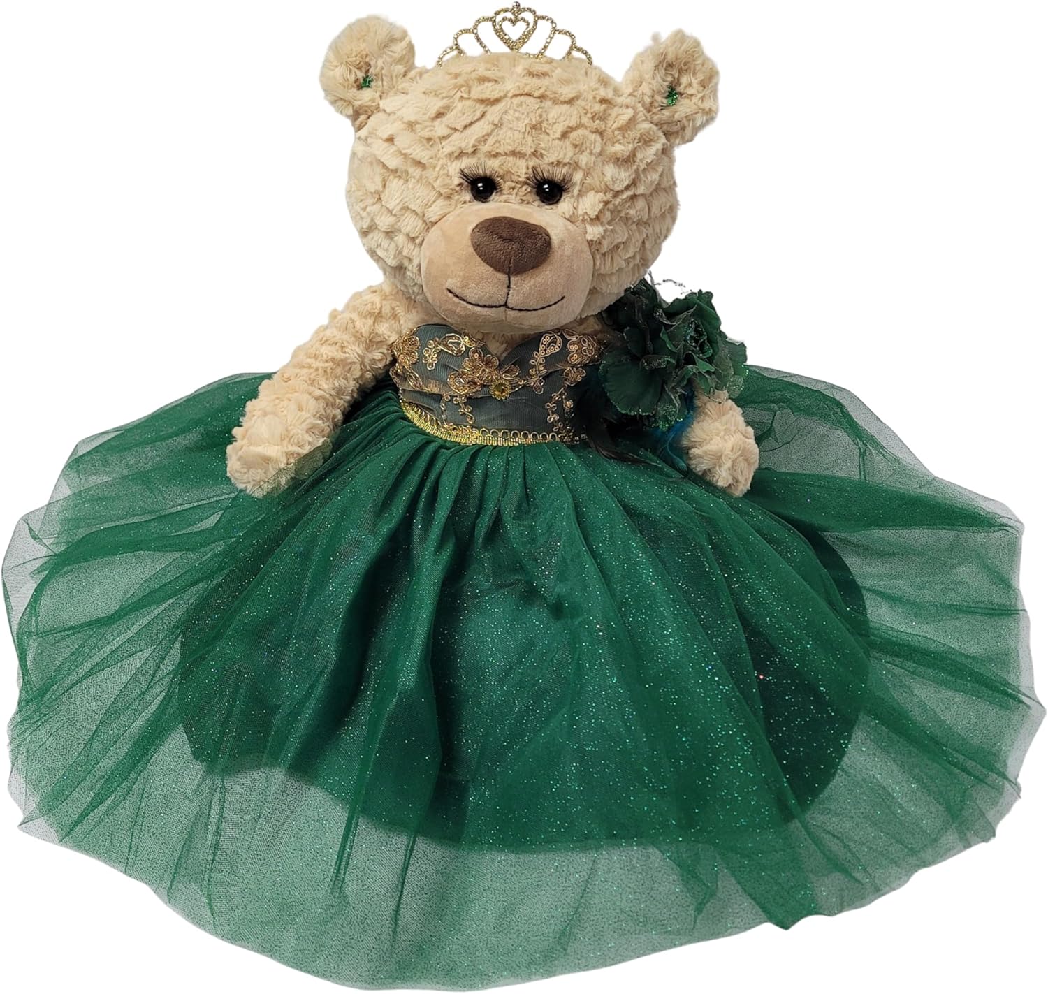 Para aquellos que buscan algo más que una muñeca ... ahora tenemos la opción de Osos de Quinceañeras. Estos osos miden 20"de largo. Color cafe claro, suave y tierno. Único con pestañas largas rizadas. El busto del vestido está decorado con brillos y la falda está hecha con 4 capas de tul con brillantina. Completo y decorado con una tiara de metal, aretes, y una flor en la muñeca.