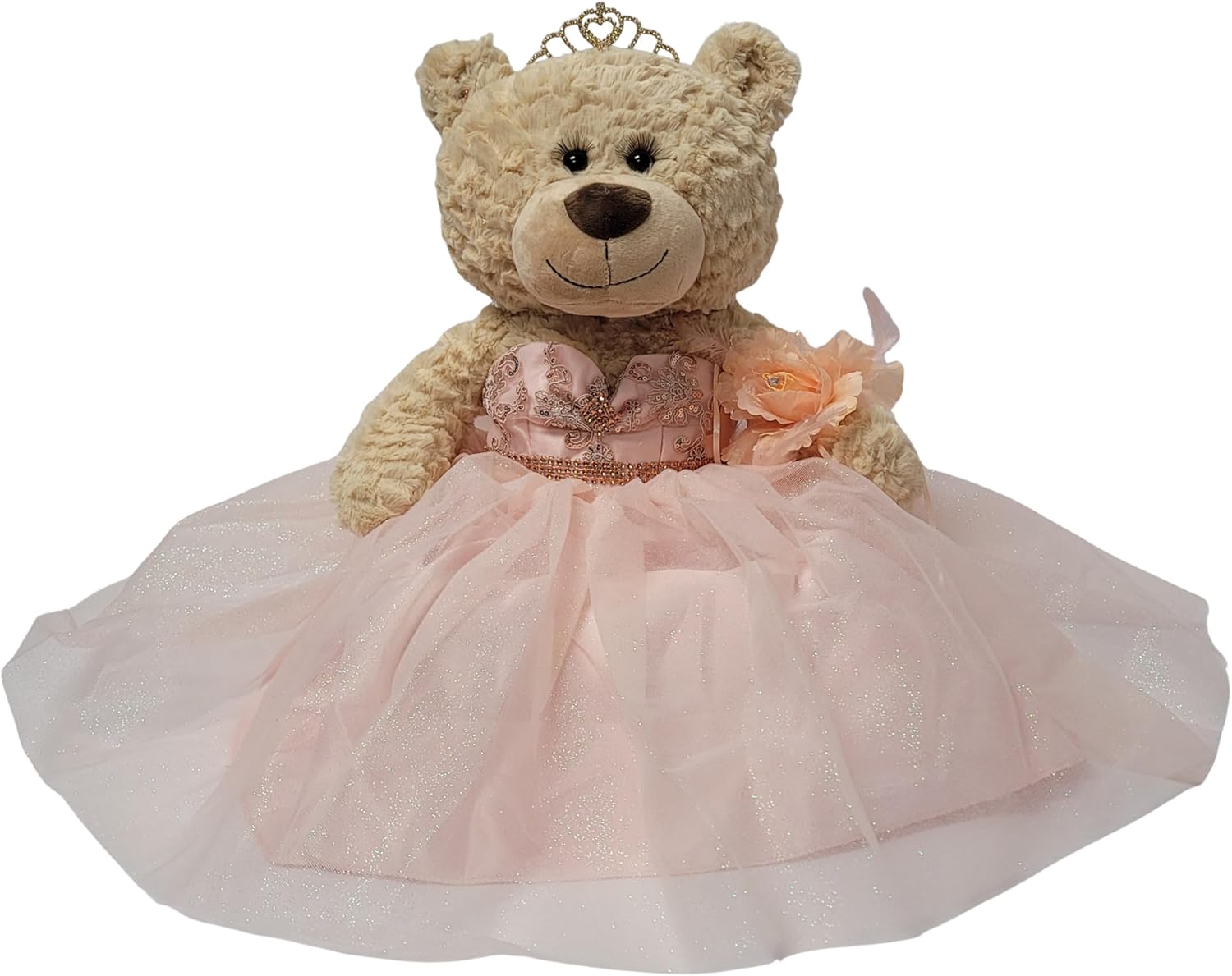 Para aquellos que buscan algo más que una muñeca ... ahora tenemos la opción de Osos de Quinceañeras. Estos osos miden 20"de largo. Color cafe claro, suave y tierno. Único con pestañas largas rizadas. El busto del vestido está decorado con brillos y la falda está hecha con 4 capas de tul con brillantina. Completo y decorado con una tiara de metal, aretes, y una flor en la muñeca.