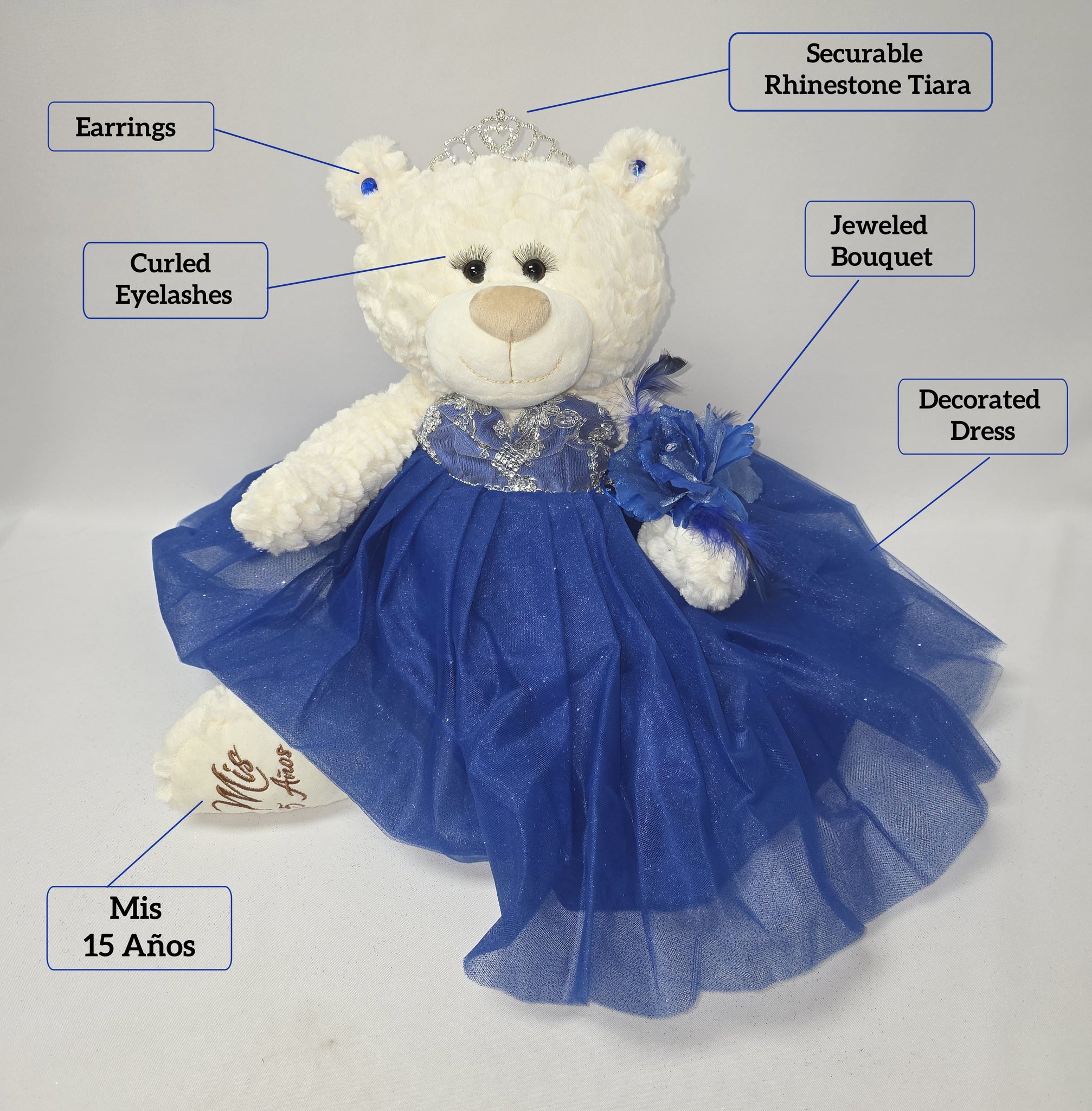 Para aquellos que buscan algo más que una muñeca ... ahora tenemos la opción de Osos de Quinceañeras. Estos osos miden 14"de largo. Color Crema, suave y tierno. Único con pestañas largas rizadas. El busto del vestido está decorado con brillos y la falda está hecha con 4 capas de tul con brillantina. Completo y decorado con una tiara de metal, aretes, y una flor en la muñeca.