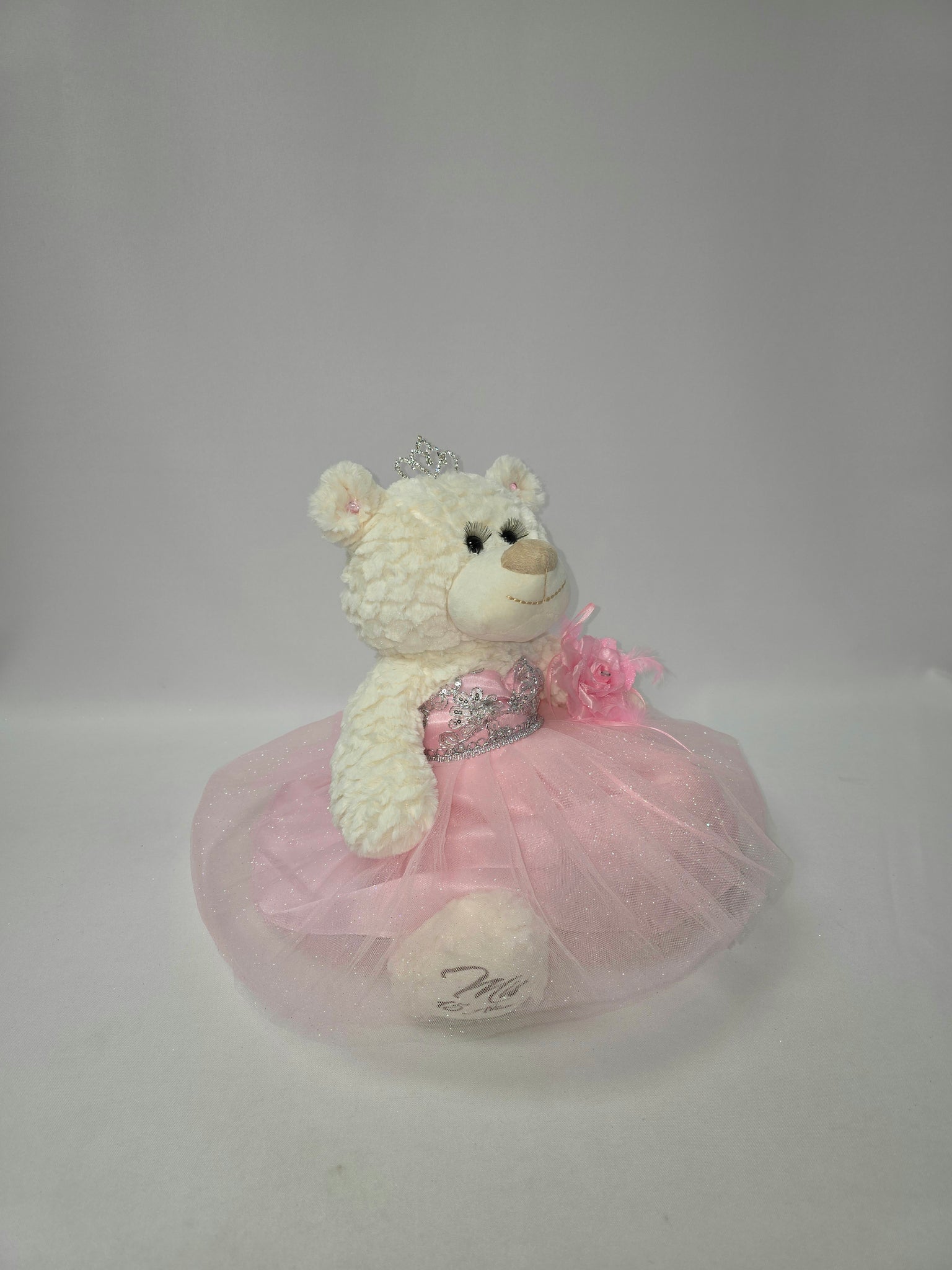 Para aquellos que buscan algo más que una muñeca ... ahora tenemos la opción de Osos de Quinceañeras. Estos osos miden 14"de largo. Color Crema, suave y tierno. Único con pestañas largas rizadas. El busto del vestido está decorado con brillos y la falda está hecha con 4 capas de tul con brillantina. El pie derecho está bordado con "Mis 15 Años", completo y decorado con una tiara de metal, aretes, y una flor en la muñeca.
