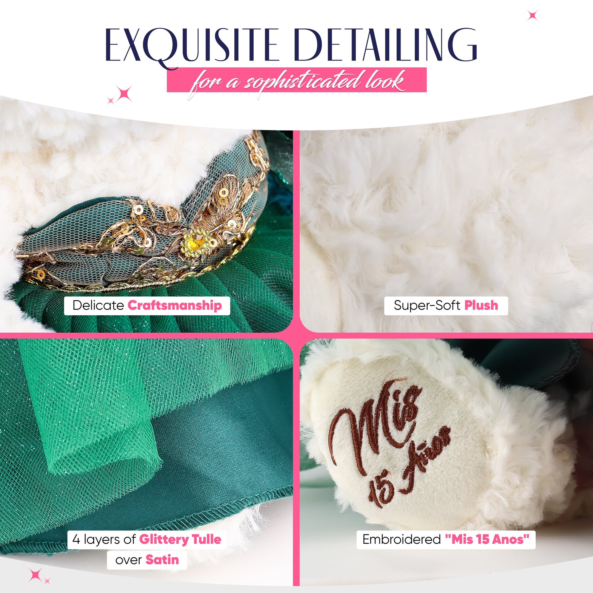Para aquellos que buscan algo más que una muñeca ... ahora tenemos la opción de Osos de Quinceañeras. Estos osos miden 14"de largo. Color Crema, suave y tierno. Único con pestañas largas rizadas. El busto del vestido está decorado con brillos  y la falda está hecha con 4 capas de tul con brillantina. El pie derecho está bordado con "Mis 15 Años", completo y decorado con una tiara de metal, aretes, y una flor en la muñeca.