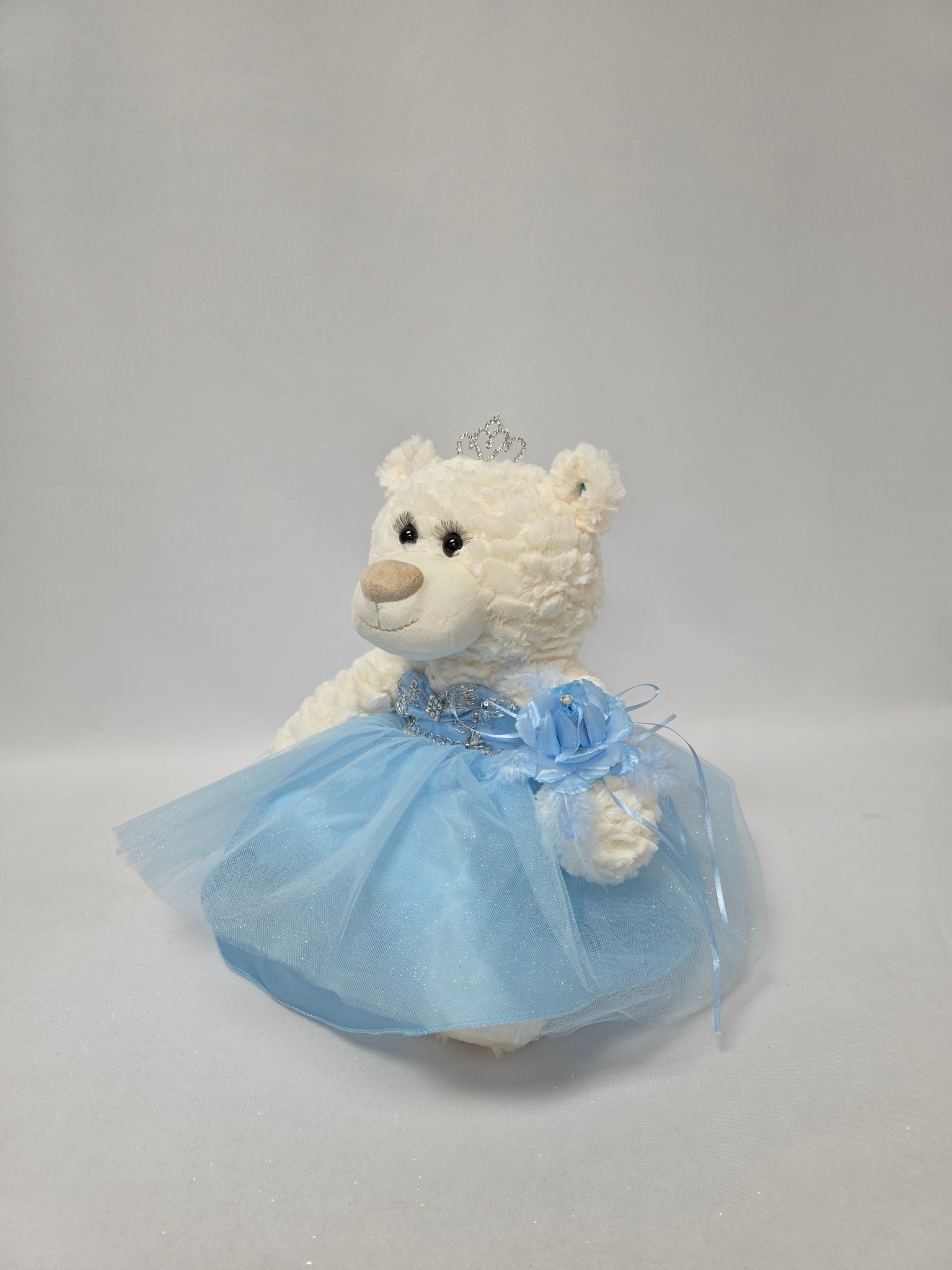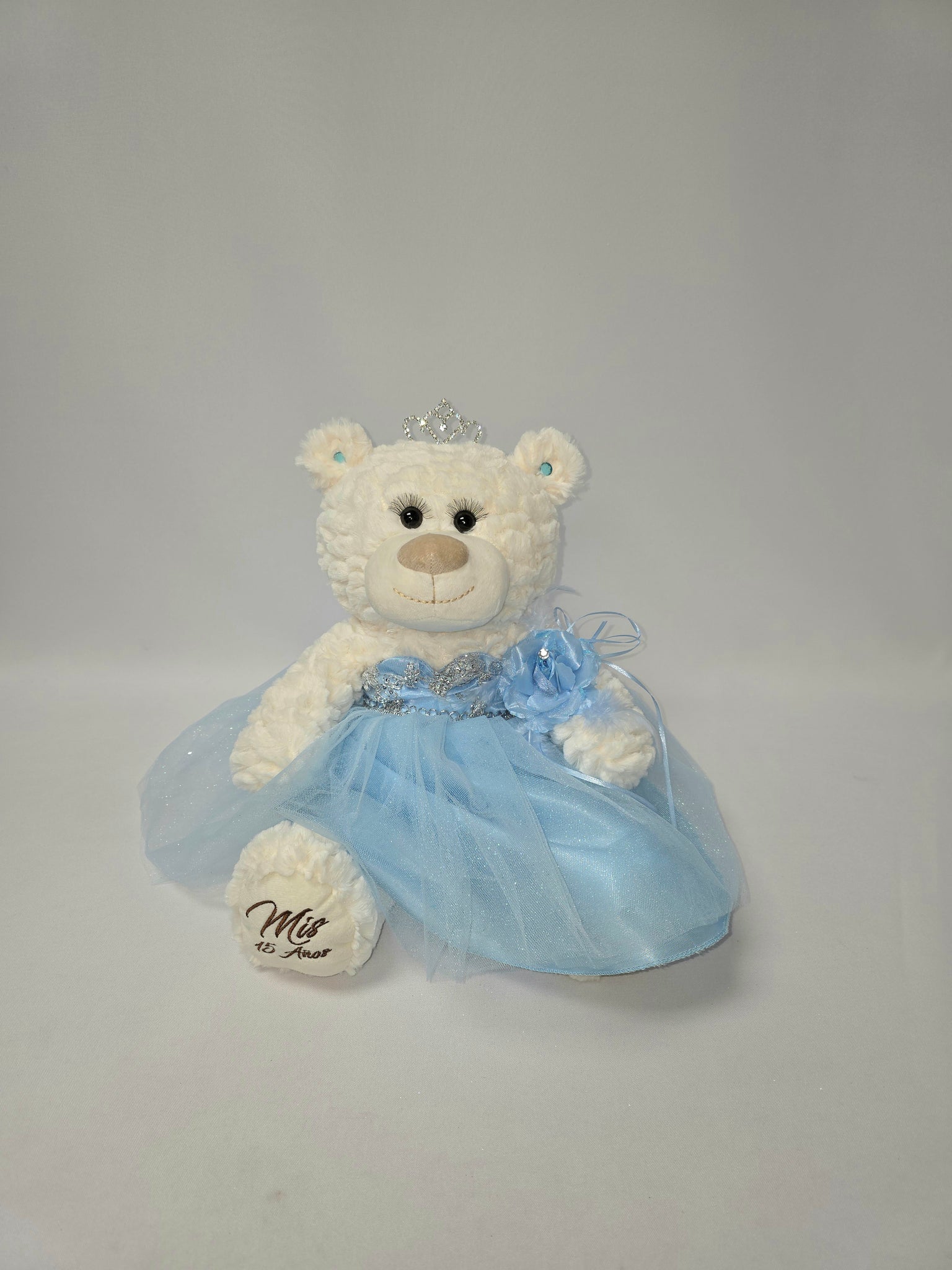 For those that are looking for something other than a doll... we now have the option of Quince Bears. These bears measure 14" long. Creme color, soft and cuddly. Unique with long curled lashes. Dress is decorated with rhinestones on top and the skirt is made of 4 layers glittery tulle material. The right foot of the bear is embroidered with "Mis 15 Años". Complete and accessorized with a metal tiara, earrings, and flower on the wrist.