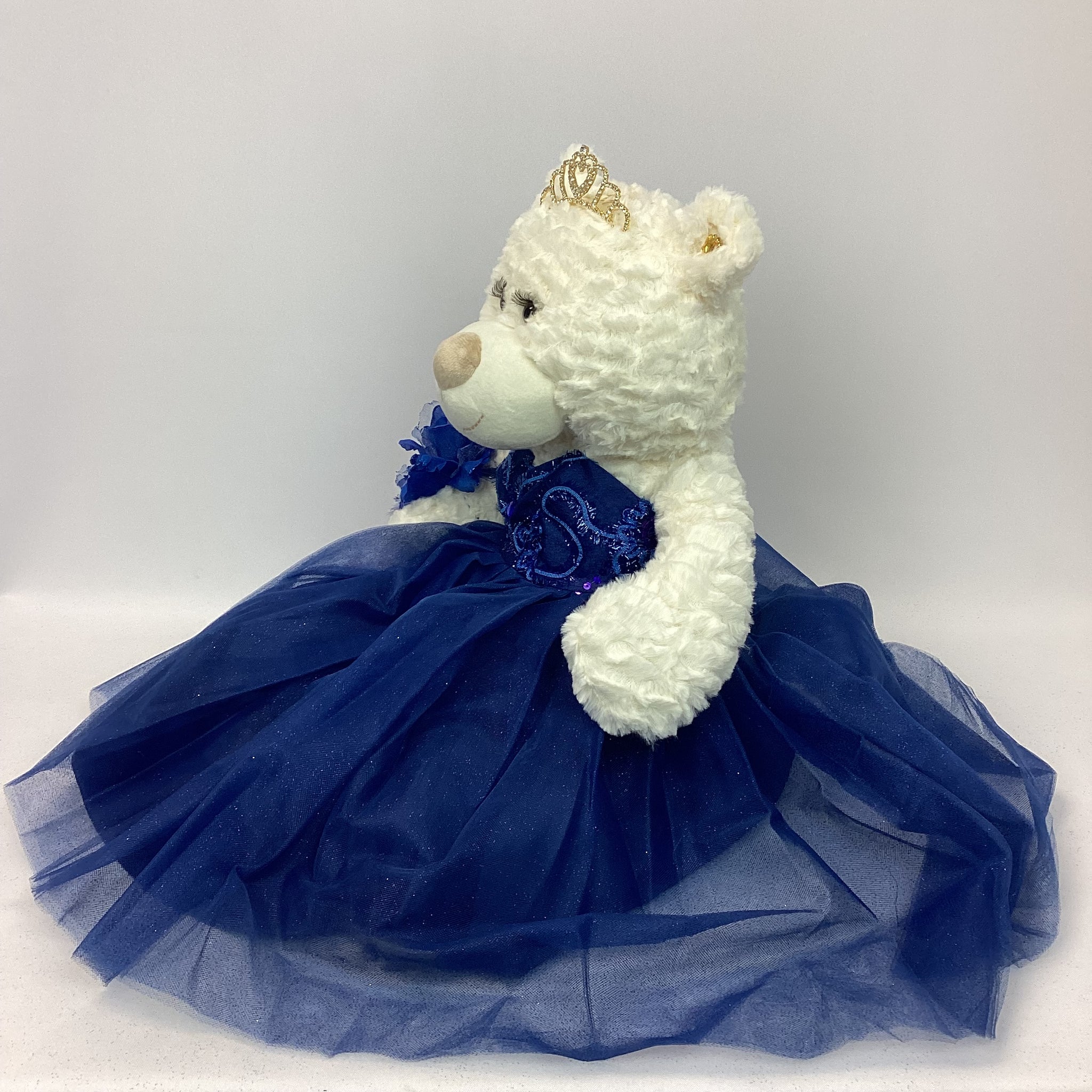 Para aquellos que buscan algo más que una muñeca ... ahora tenemos la opción de Osos de Quinceañeras. Estos osos miden 20"de largo. Color Crema, suave y tierno. Único con pestañas largas rizadas. El busto del vestido está decorado con brillos y la falda está hecha con 4 capas de tul con brillantina. Completo y decorado con una tiara de metal, aretes, y una flor en la muñeca.