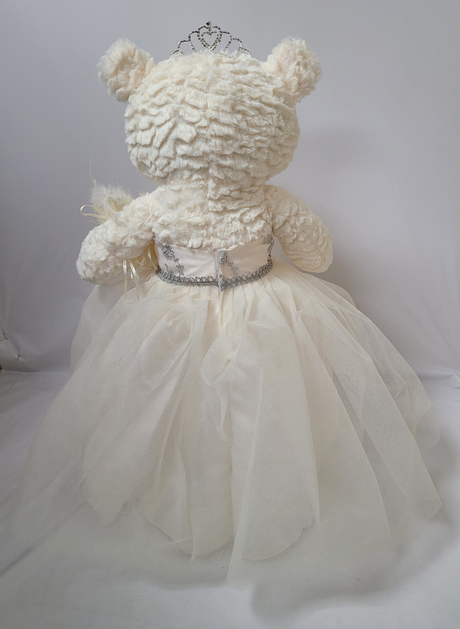 Para aquellos que buscan algo más que una muñeca ... ahora tenemos la opción de Osos de Quinceañeras. Estos osos miden 20"de largo. Color Crema, suave y tierno. Único con pestañas largas rizadas. El busto del vestido está decorado con brillos y la falda está hecha con 4 capas de tul con brillantina. El pie derecho está bordado con "Mis 15 Años", completo y decorado con una tiara de metal, aretes, y una flor en la muñeca.