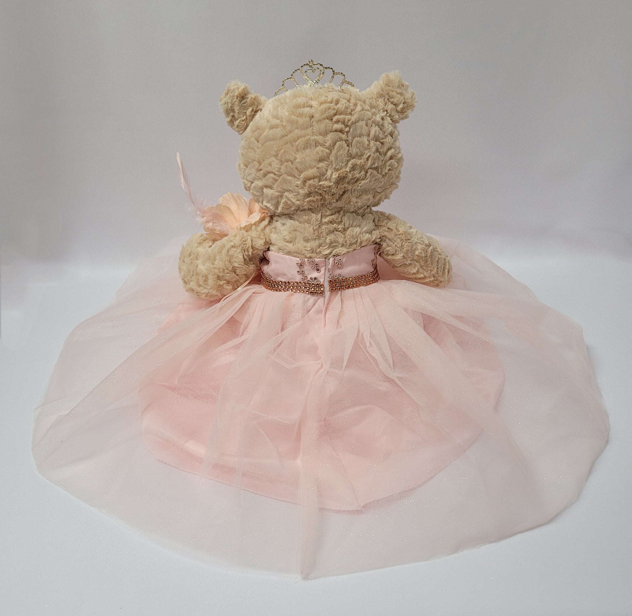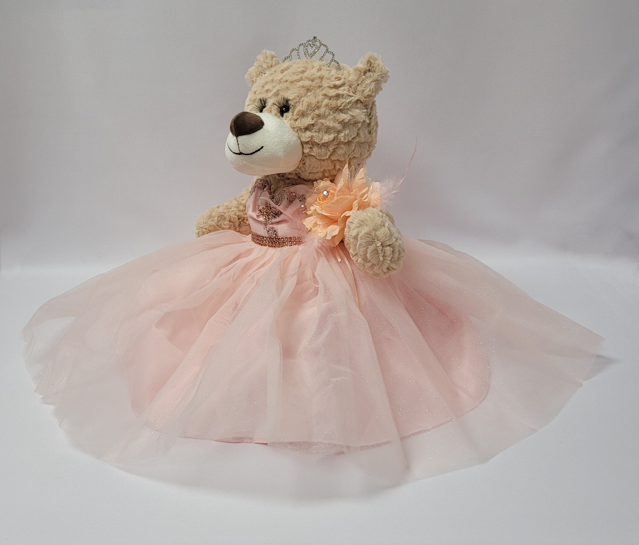 Para aquellos que buscan algo más que una muñeca ... ahora tenemos la opción de Osos de Quinceañeras. Estos osos miden 20"de largo. Color cafe claro, suave y tierno. Único con pestañas largas rizadas. El busto del vestido está decorado con brillos y la falda está hecha con 4 capas de tul con brillantina. El pie derecho está bordado con "Sweet 16", completo y decorado con una tiara de metal, aretes, y una flor en la muñeca.