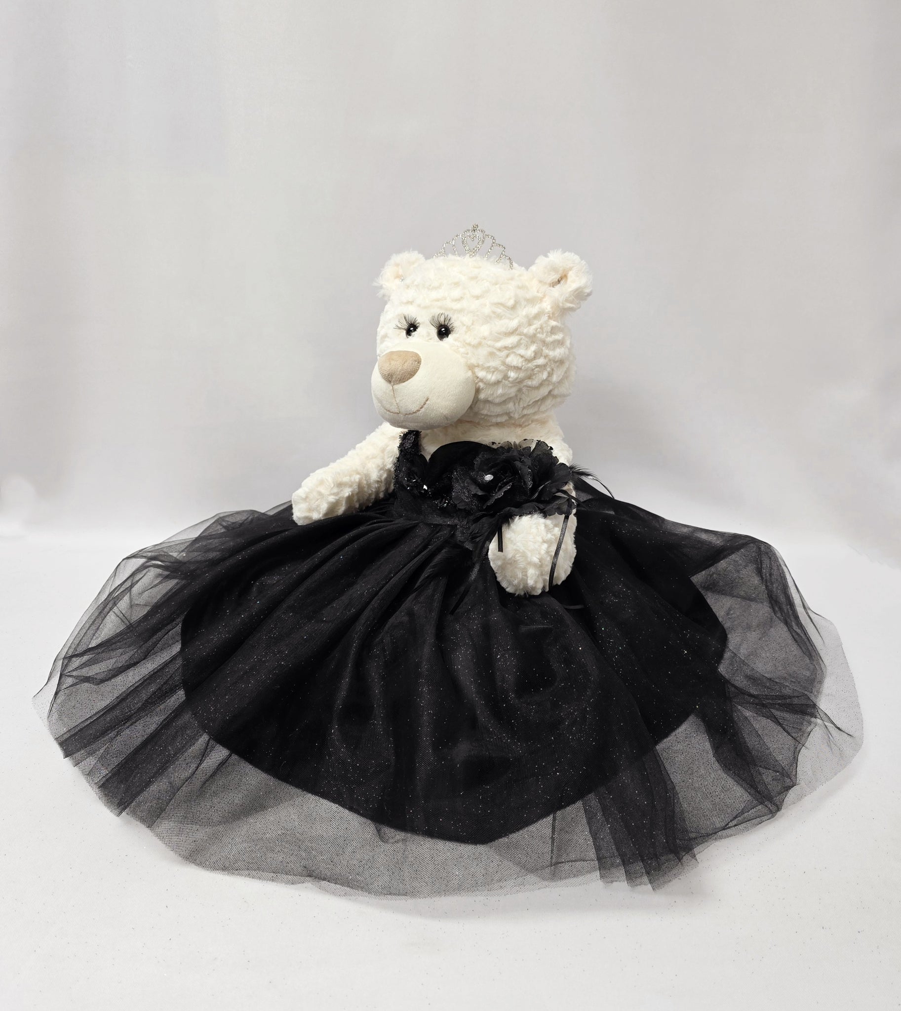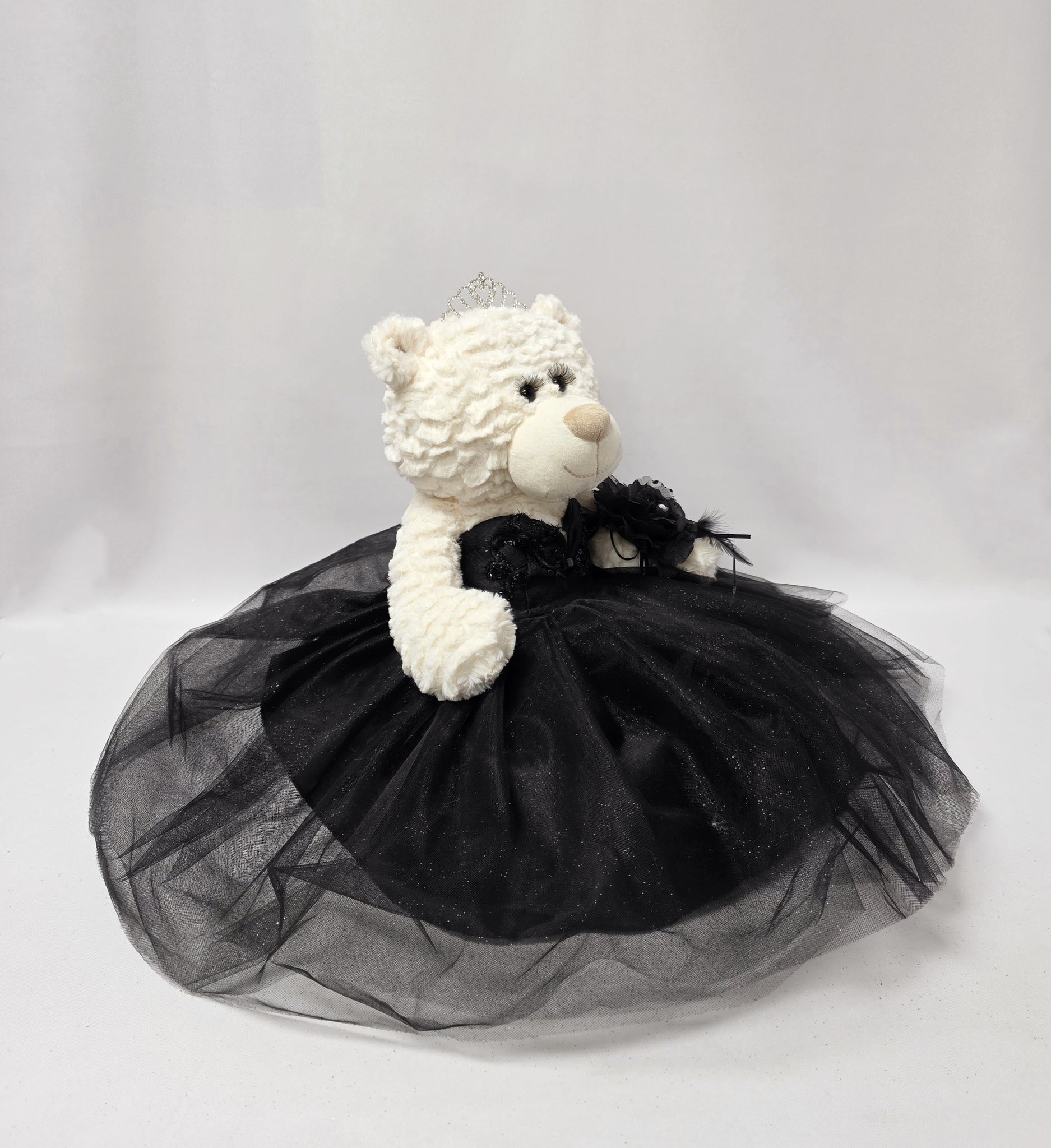 Para aquellos que buscan algo más que una muñeca ... ahora tenemos la opción de Osos de Quinceañeras. Estos osos miden 20"de largo. Color Crema, suave y tierno. Único con pestañas largas rizadas. El busto del vestido está decorado con brillos y la falda está hecha con 4 capas de tul con brillantina. El pie derecho está bordado con "Sweet 16", completo y decorado con una tiara de metal, aretes, y una flor en la muñeca.