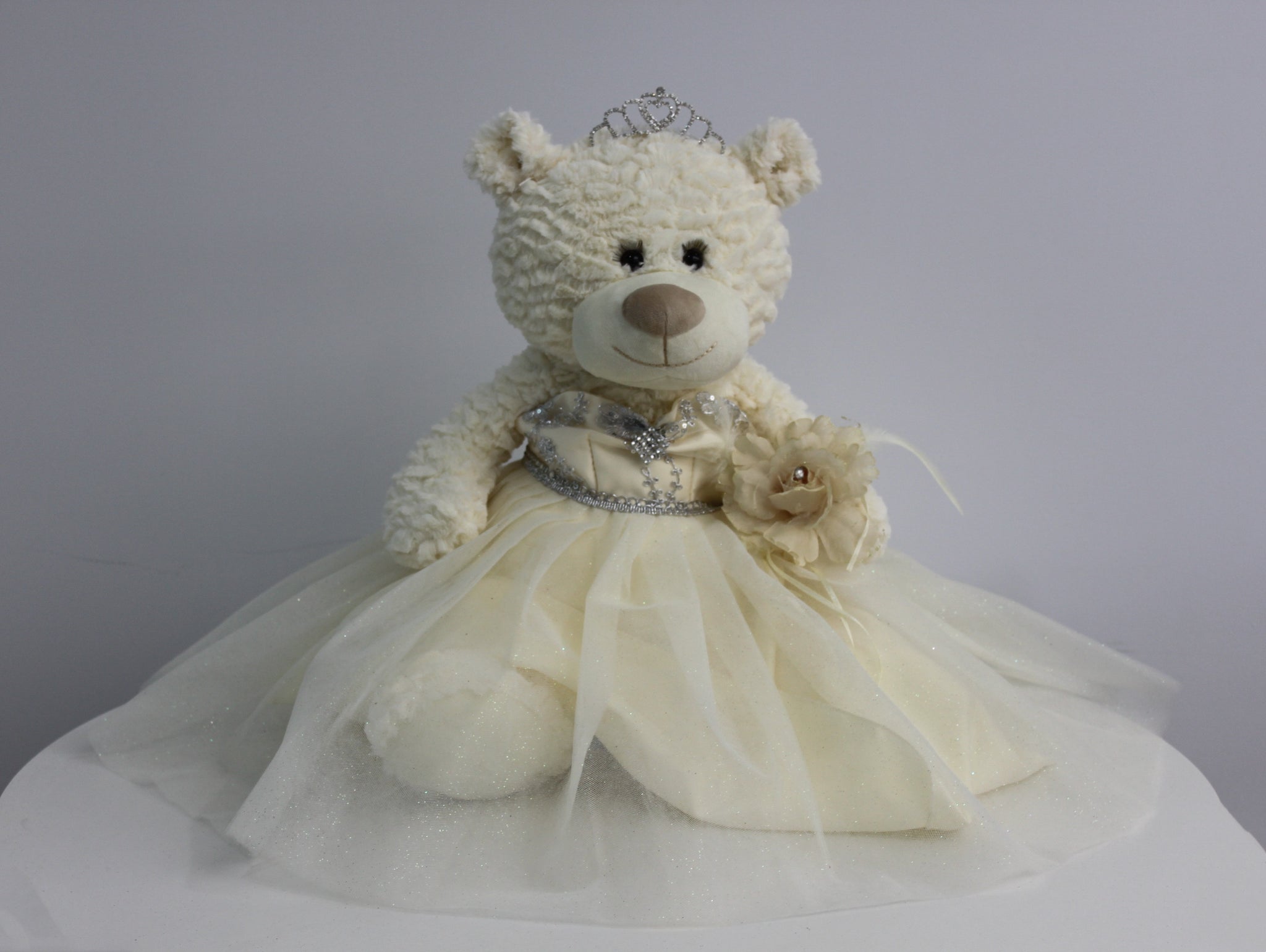 Para aquellos que buscan algo más que una muñeca ... ahora tenemos la opción de Osos de Quinceañeras. Estos osos miden 20"de largo. Color Crema, suave y tierno. Único con pestañas largas rizadas. El busto del vestido está decorado con brillos y la falda está hecha con 4 capas de tul con brillantina. Completo y decorado con una tiara de metal, aretes, y una flor en la muñeca.