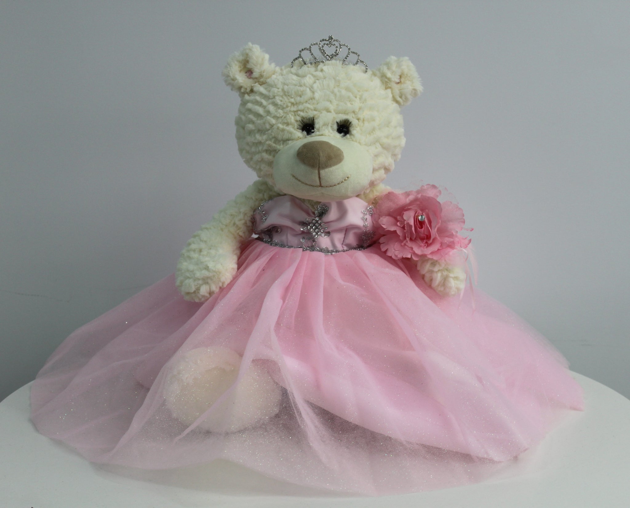 Para aquellos que buscan algo más que una muñeca ... ahora tenemos la opción de Osos de Quinceañeras. Estos osos miden 20"de largo. Color Crema, suave y tierno. Único con pestañas largas rizadas. El busto del vestido está decorado con brillos y la falda está hecha con 4 capas de tul con brillantina. Completo y decorado con una tiara de metal, aretes, y una flor en la muñeca.