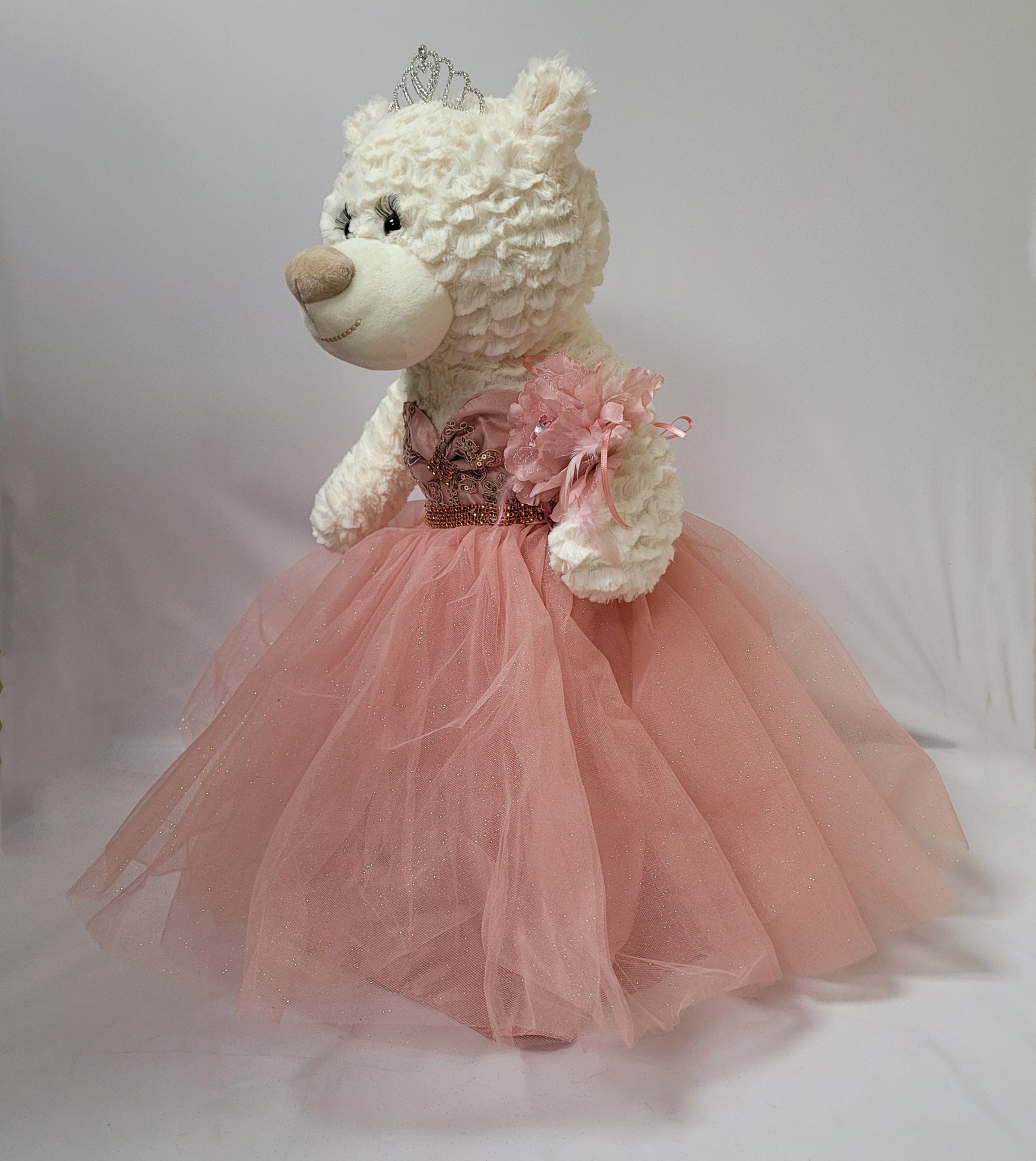 For those that are looking for something other than a doll... we now have the option of Quince Bears. These bears measure 20" long. Creme color, soft and cuddly. Unique with long curled lashes. Dress is decorated with rhinestones on top and the skirt is made of 4 layers glittery tulle material. Complete and accessorized with a metal tiara, earrings, and flower on the wrist.