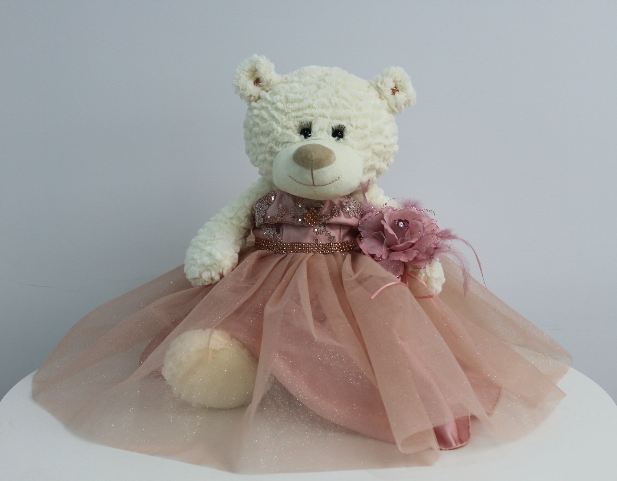 Para aquellos que buscan algo más que una muñeca ... ahora tenemos la opción de Osos de Quinceañeras. Estos osos miden 20"de largo. Color Crema, suave y tierno. Único con pestañas largas rizadas. El busto del vestido está decorado con brillos y la falda está hecha con 4 capas de tul con brillantina. Completo y decorado con una tiara de metal, aretes, y una flor en la muñeca.