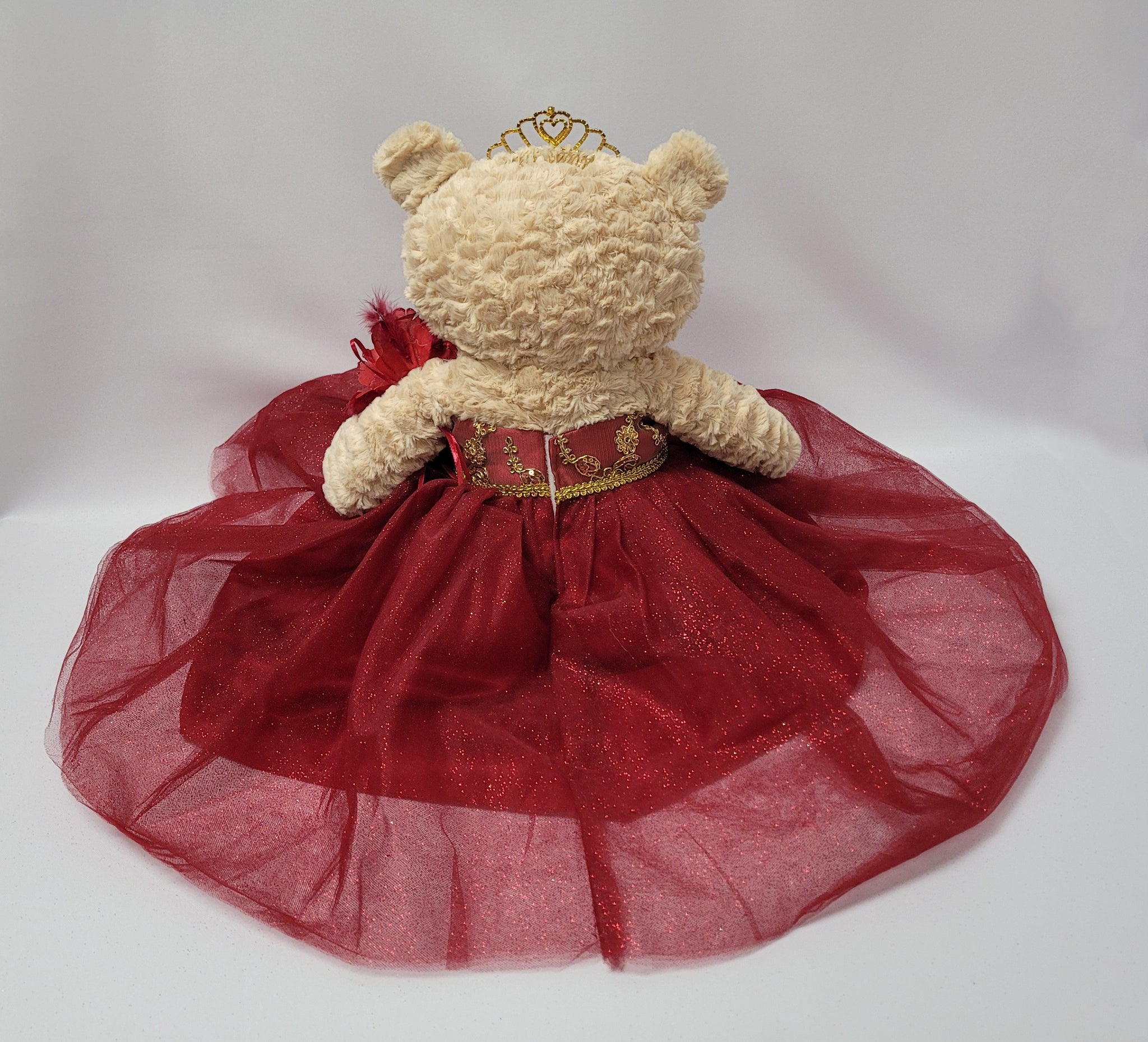 20" Cute Plush Bears for any occasion, for those looking for something other than a doll... we now have the option of these Bears. These bears measure 20" long. Light brown color, soft and cuddly. Unique with long curled lashes. Dress is decorated with rhinestones on top and the skirt is made of 4 layers glittery tulle material. Complete and accessorized with a metal tiara, earrings, and flower on the wrist.