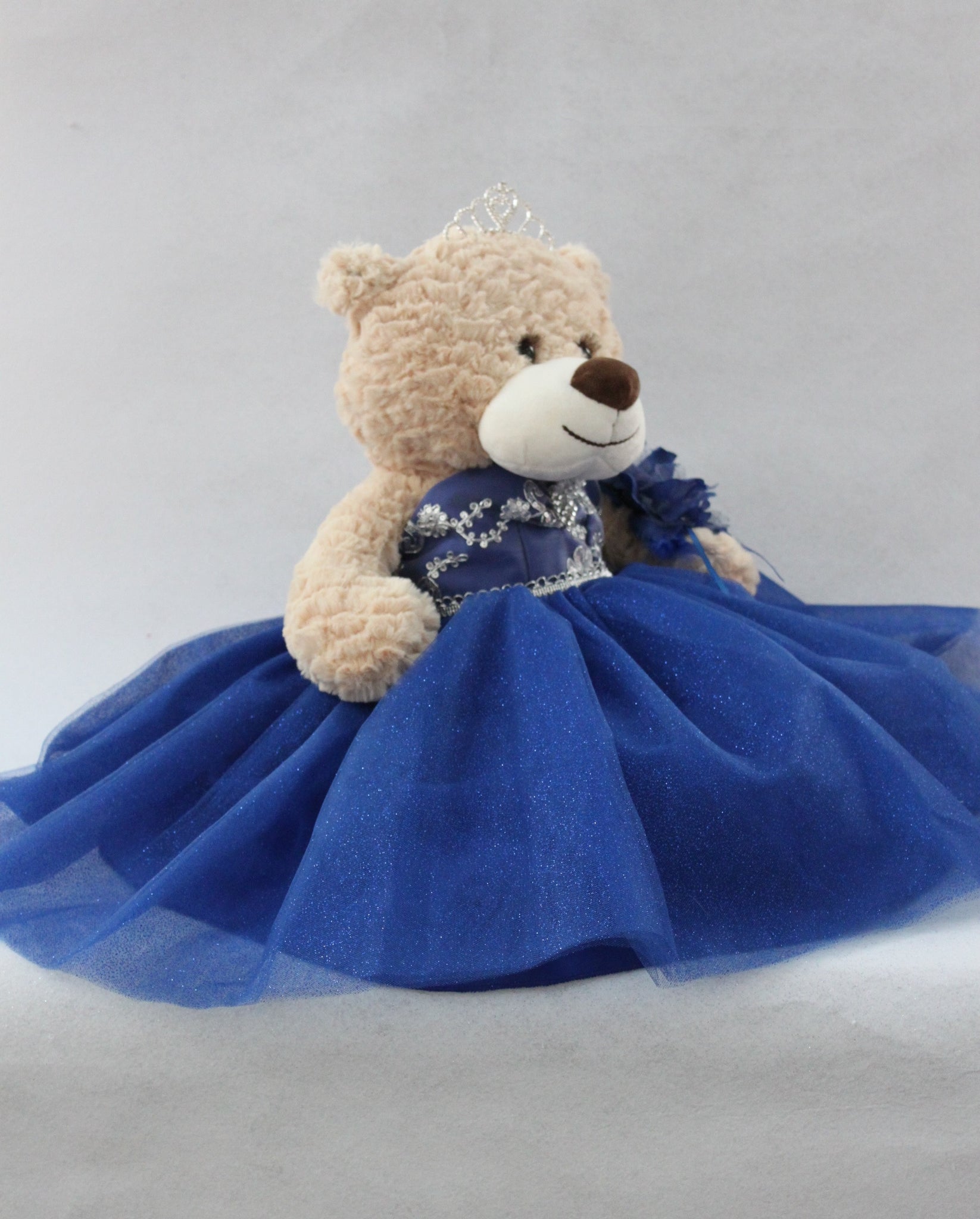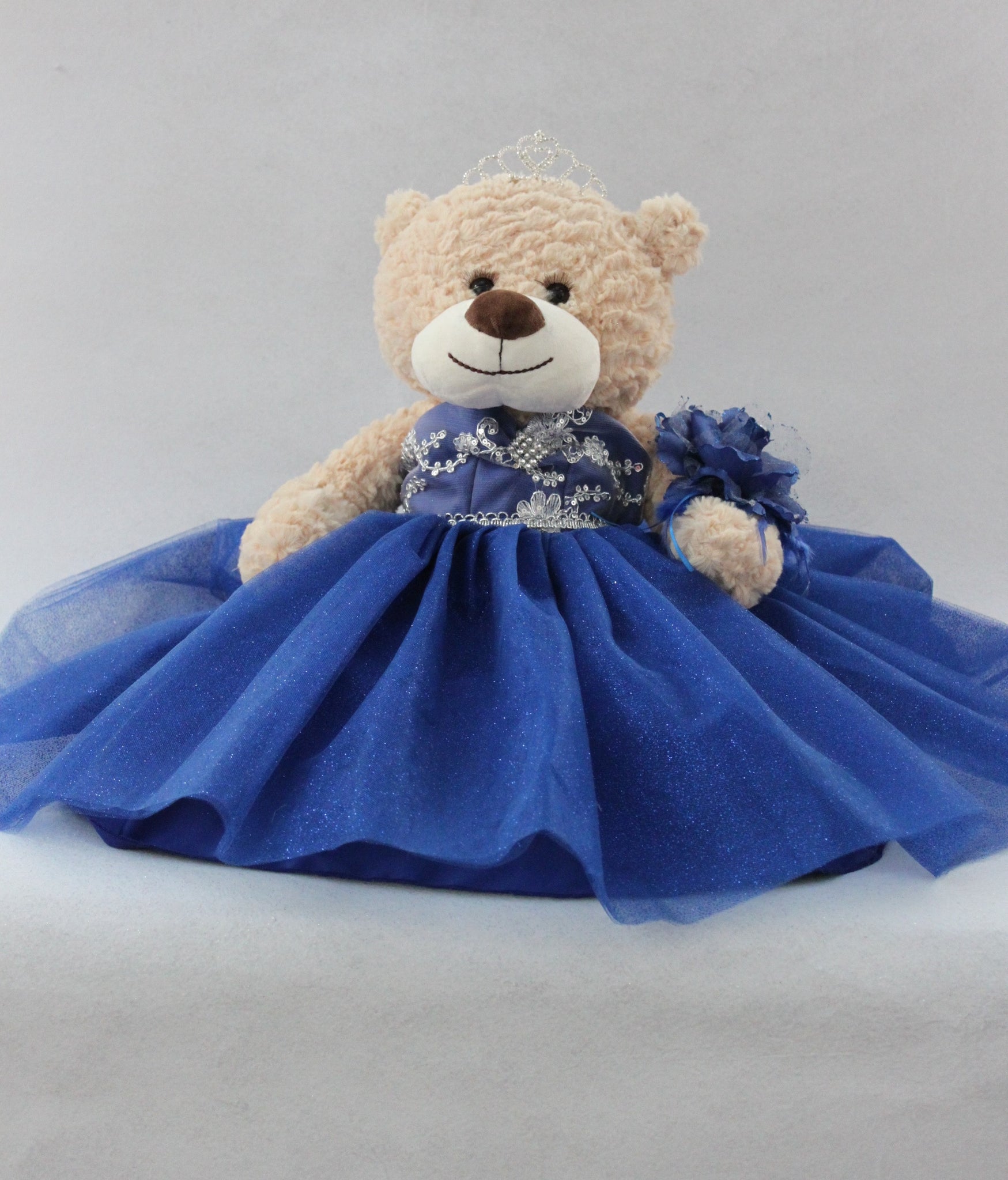 Para aquellos que buscan algo más que una muñeca ... ahora tenemos la opción de Osos de Quinceañeras. Estos osos miden 20"de largo. Color cafe claro, suave y tierno. Único con pestañas largas rizadas. El busto del vestido está decorado con brillos  y la falda está hecha con 4 capas de tul con brillantina. El pie derecho está bordado con "Sweet 16", completo y decorado con una tiara de metal, aretes, y una flor en la muñeca.