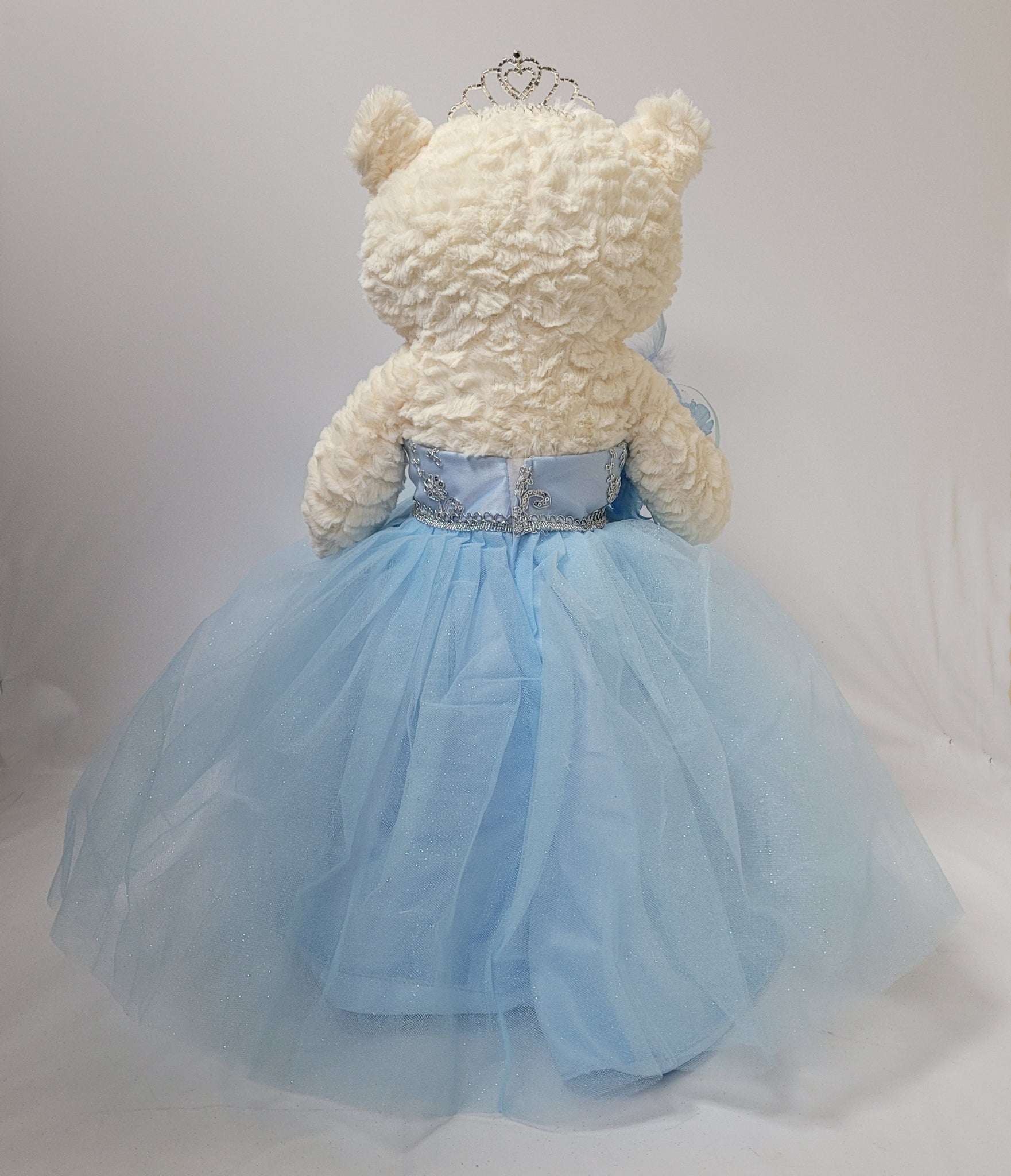 Para aquellos que buscan algo más que una muñeca ... ahora tenemos la opción de Osos de Quinceañeras. Estos osos miden 20"de largo. Color Crema, suave y tierno. Único con pestañas largas rizadas. El busto del vestido está decorado con brillos y la falda está hecha con 4 capas de tul con brillantina. El pie derecho está bordado con "Sweet 16", completo y decorado con una tiara de metal, aretes, y una flor en la muñeca.