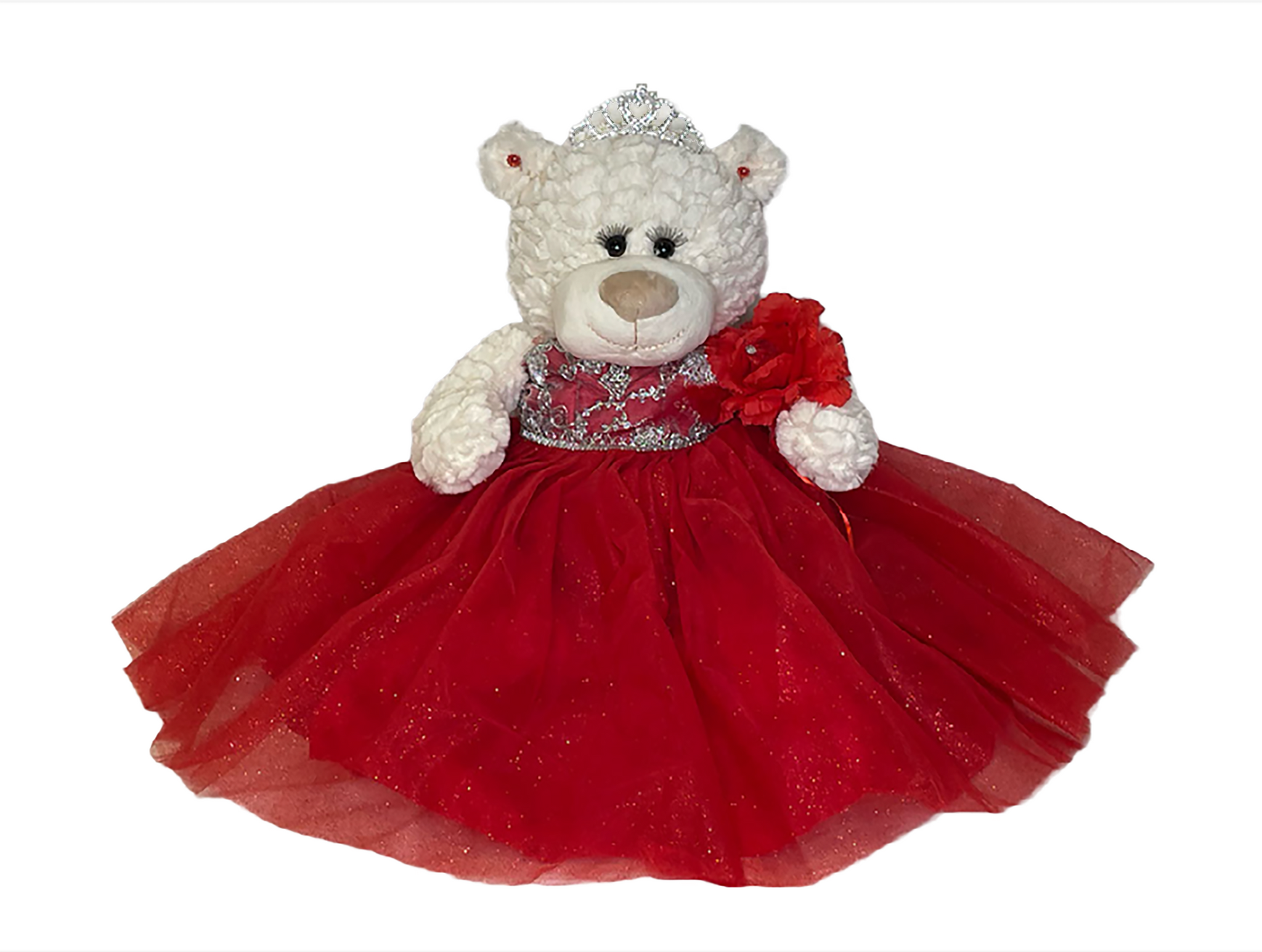 Para aquellos que buscan algo más que una muñeca ... ahora tenemos la opción de Osos de Quinceañeras. Estos osos miden 20"de largo. Color Crema, suave y tierno. Único con pestañas largas rizadas. El busto del vestido está decorado con brillos y la falda está hecha con 4 capas de tul con brillantina. El pie derecho está bordado con "Sweet 16", completo y decorado con una tiara de metal, aretes, y una flor en la muñeca.