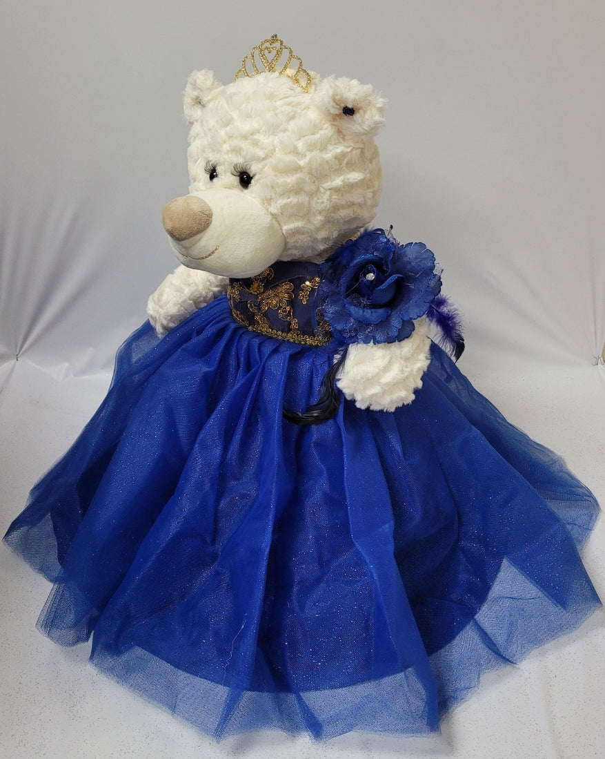 Para aquellos que buscan algo más que una muñeca ... ahora tenemos la opción de Osos de Quinceañeras. Estos osos miden 20"de largo. Color Crema, suave y tierno. Único con pestañas largas rizadas. El busto del vestido está decorado con brillos y la falda está hecha con 4 capas de tul con brillantina. Completo y decorado con una tiara de metal, aretes, y una flor en la muñeca.