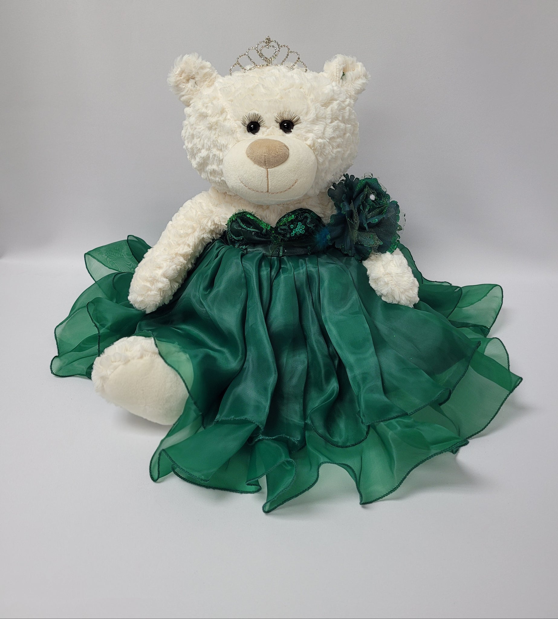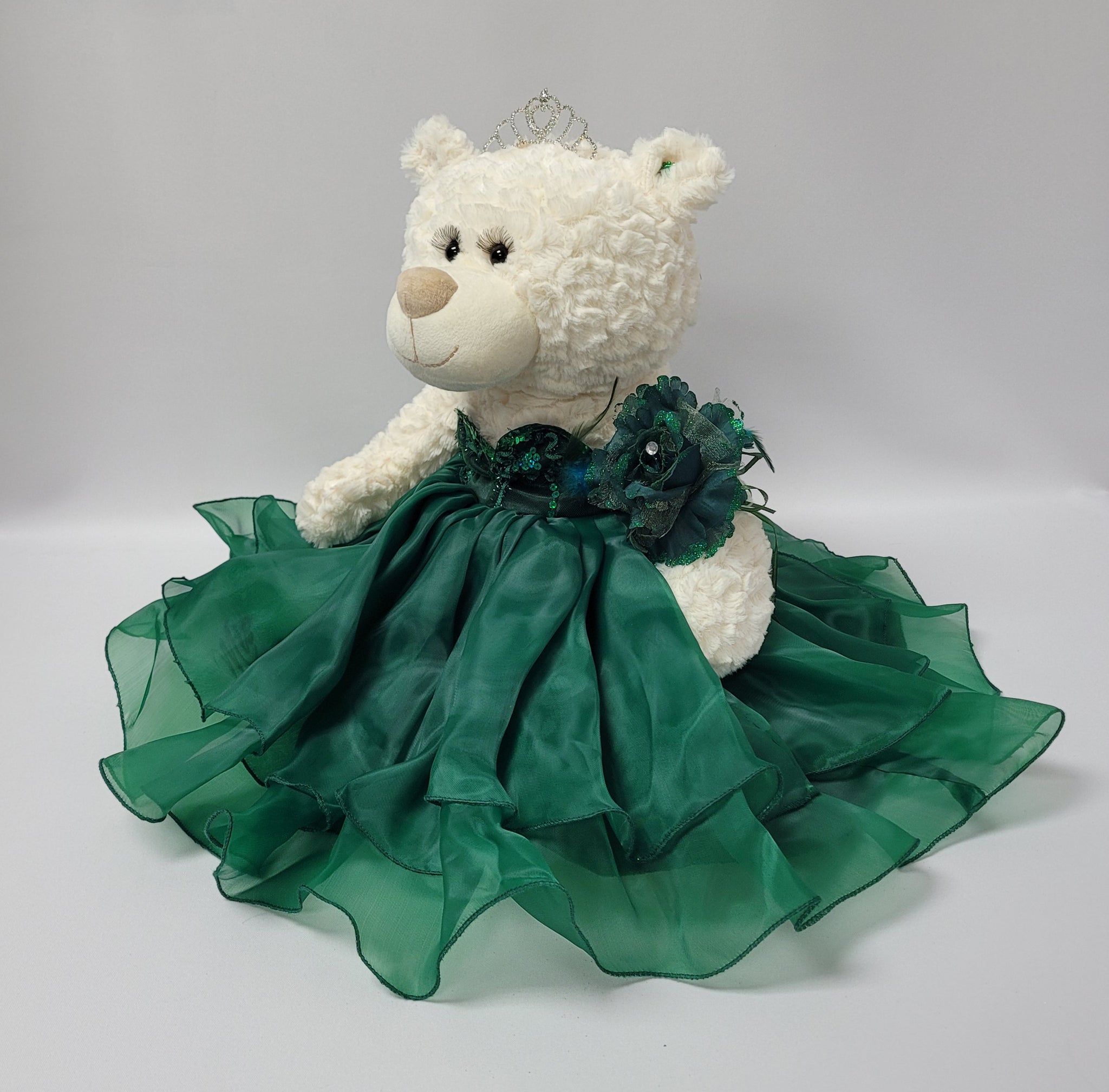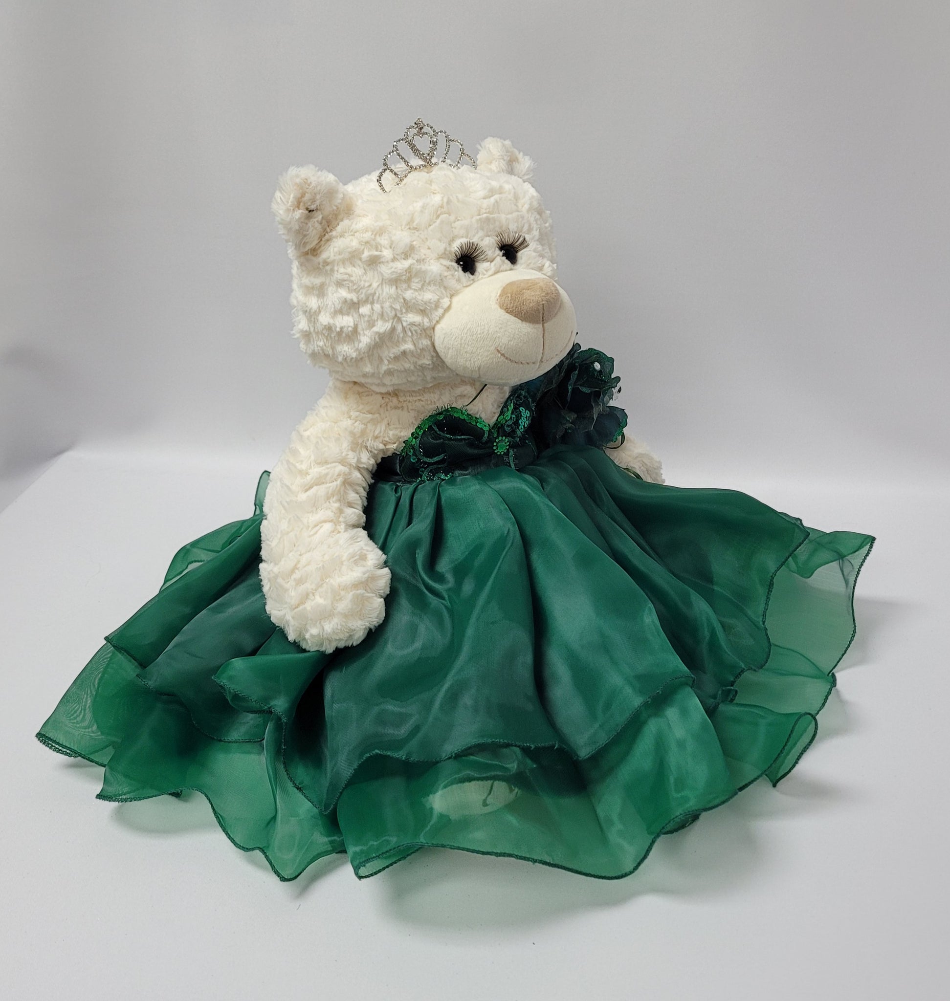 Para aquellos que buscan algo más que una muñeca ... ahora tenemos la opción de Osos de Quinceañeras. Estos osos miden 20"de largo. Color Crema, suave y tierno. Único con pestañas largas rizadas. El busto del vestido está decorado con lentejuelas y la falda está hecha con 3 capas de organza y satin. Completo y decorado con una tiara de metal, aretes, y una flor en la muñeca.