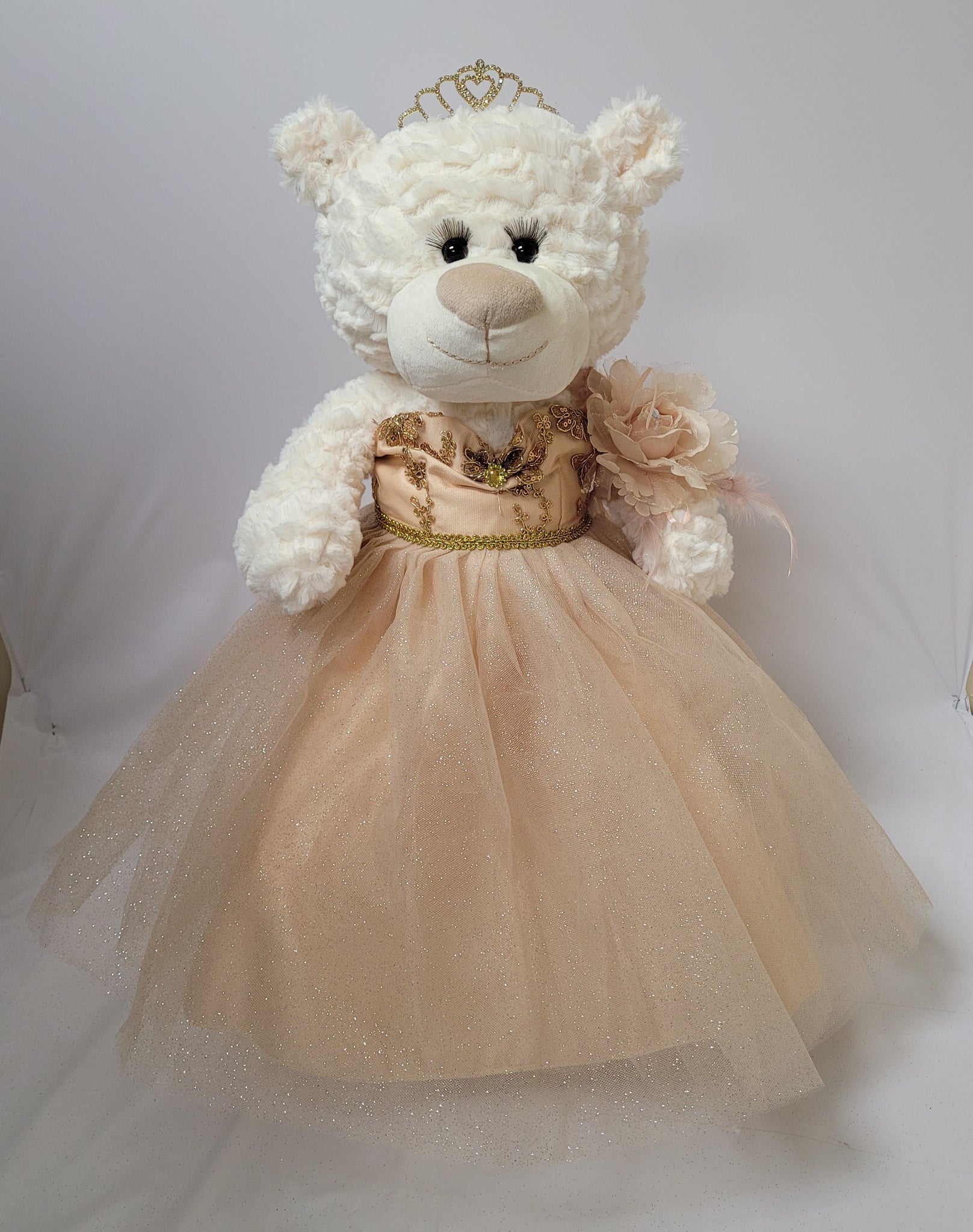 For those that are looking for something other than a doll... we now have the option of Quince Bears. These bears measure 20" long. Creme color, soft and cuddly. Unique with long curled lashes. Dress is decorated with rhinestones on top and the skirt is made of 4 layers glittery tulle material. Complete and accessorized with a metal tiara, earrings, and flower on the wrist.