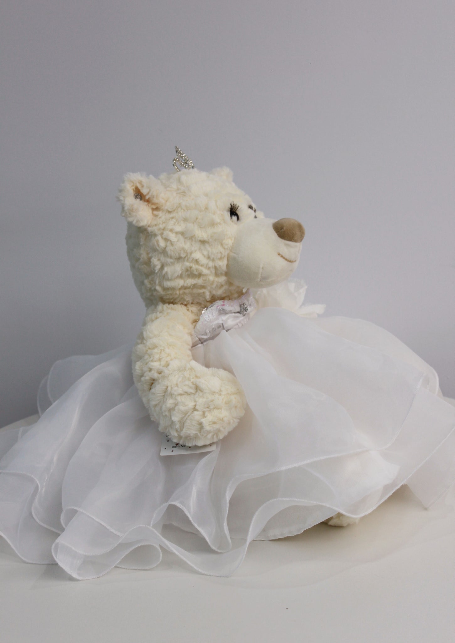 Para aquellos que buscan algo más que una muñeca ... ahora tenemos la opción de Osos de Quinceañeras. Estos osos miden 20"de largo. Color Crema, suave y tierno. Único con pestañas largas rizadas. El busto del vestido está decorado con lentejuelas y la falda está hecha con 3 capas de organza y satin. Completo y decorado con una tiara de metal, aretes, y una flor en la muñeca.